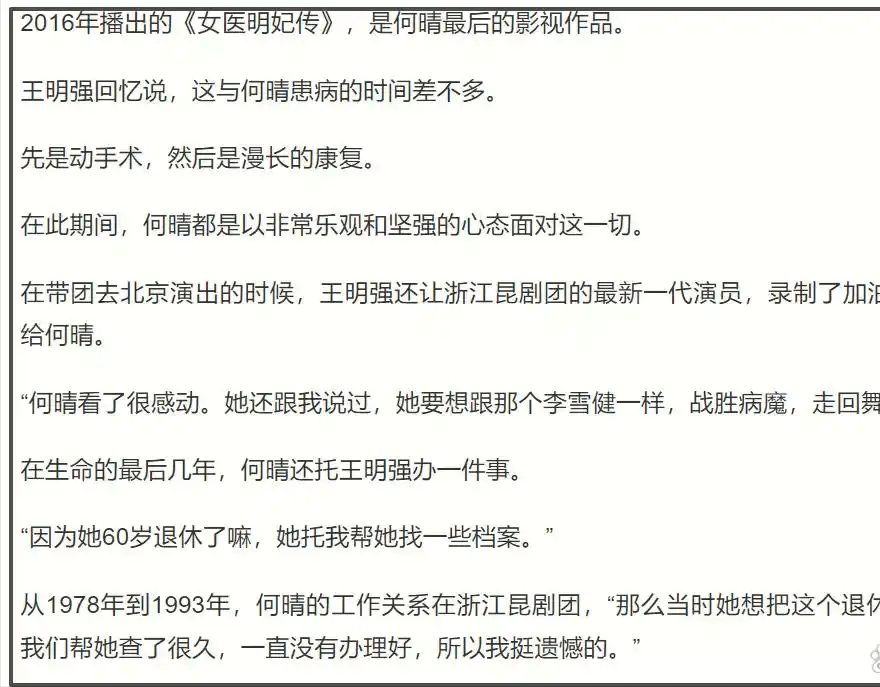这也是为什么,何晴总是很在乎自己的退休金,她委托老友王明强帮忙办理自己的退休金。因为王明强是何晴在浙江昆剧团的老同事,为了何晴的退休金他奔走查找相关档案长达3年。